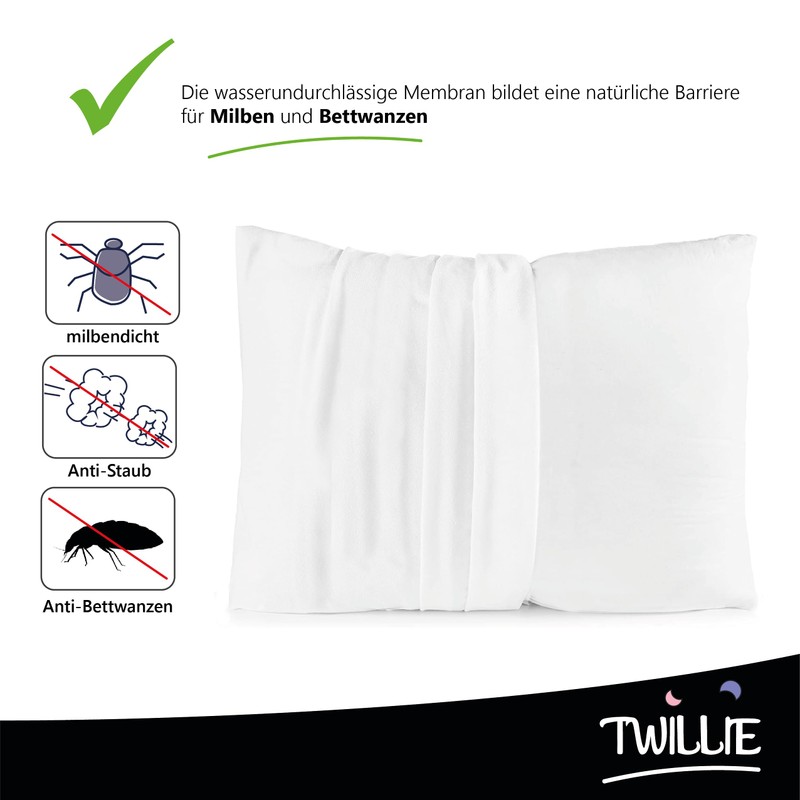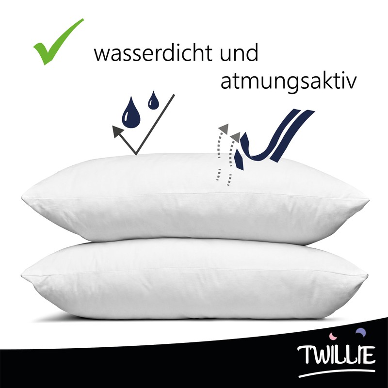 - Your cushions stay healthy and hygienic – the Twillie pillow protectors 40 x 80 cm are 100% waterproof – the fabric layer made of 100% polyester, knitted in micro mesh (jersey style for maximum softness and unsurpassed strength) and the polyurethane membrane completely prevent all liquids, saliva, sweat, by letting the air through. So you can combine complete user comfort with absolute safety for your pillow