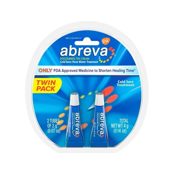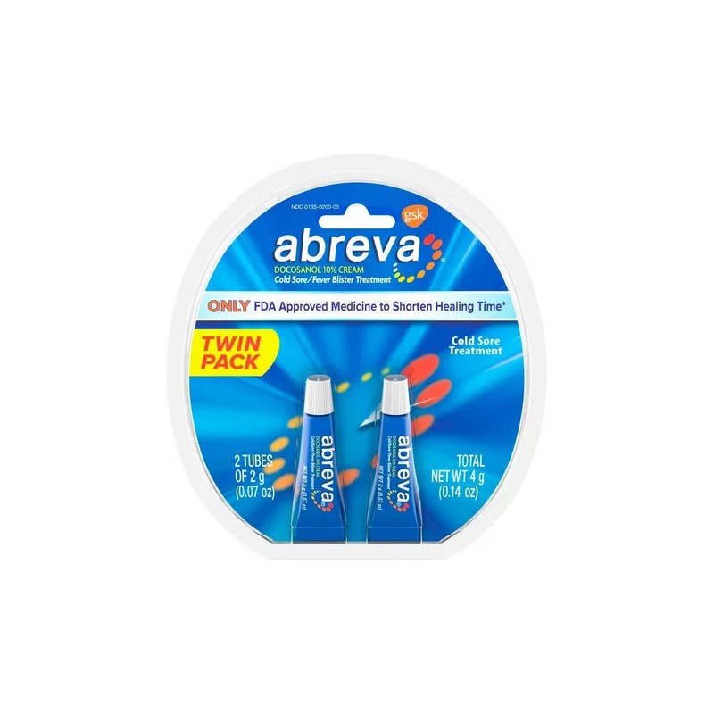 Abreva Twin Pack (2 g c/u) es el tratamiento número 1 para el herpes labial en EE.UU., clínicamente probado y dermatológicamente testeado. Su fórmula con 10% de docosanol actúa desde el primer signo para bloquear el virus, acelerar la curación y reducir la duración del brote.