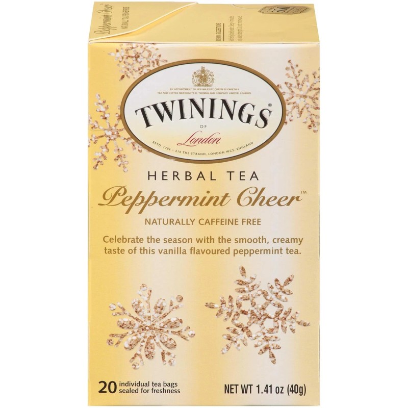- Twinings Peppermint Cheer Herbal Tea, Individually Wrapped Bags, Caffeine Free, Peppermint & Vanilla