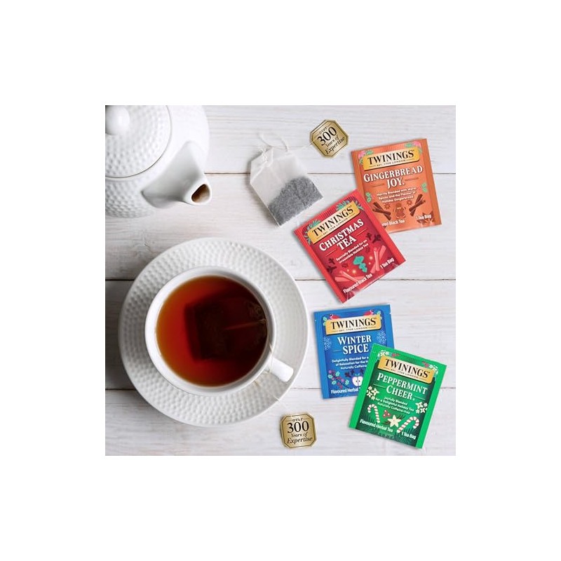 - 40 PACK 4 SEASONAL COLLECTION: Twinings Tea Bags Sampler Assortment Variety Pack features 40 tea bags 4 flavors with a perfect variety of Twinings teas, Peppermint Cheer, Gingerbread Joy, Christmas Black Tea, Winter Spice Herbal Tea