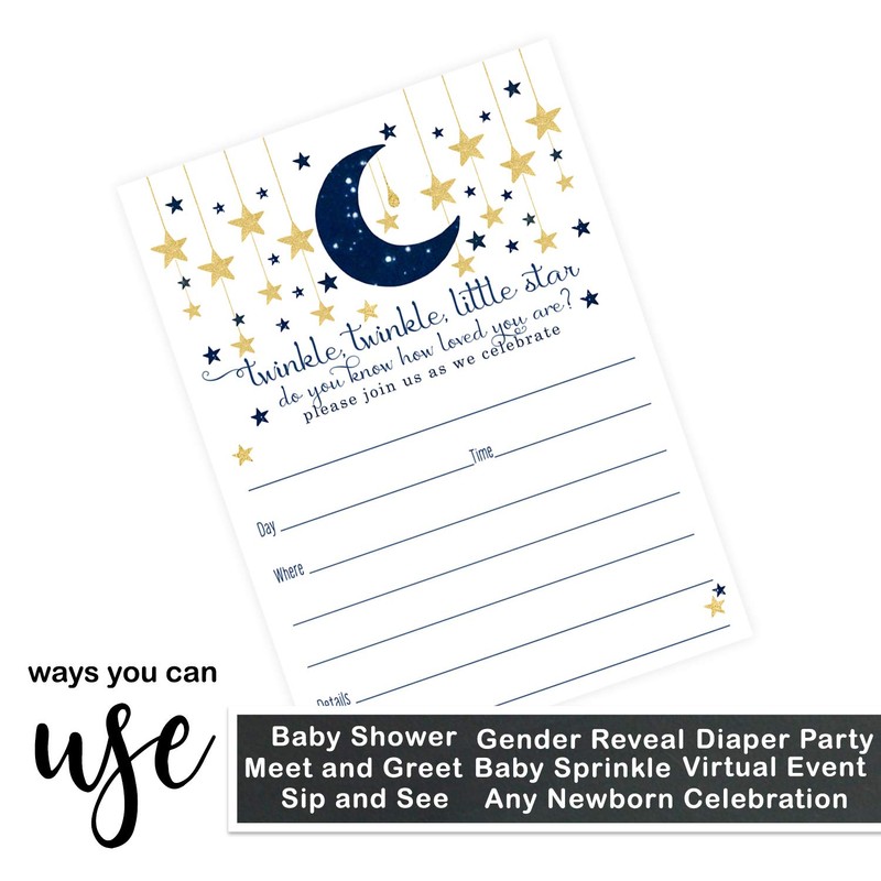 - Announce You’re Invited: make planning your baby shower fun and get everyone excited about the big day. With this set of invitations and envelopes you can handwrite personalized custom details on blank invitations for baby shower. This pack of printed twinkle little star invites is perfect for announcing the boys baby shower, sprinkle, gender reveal or any event celebrating mommy to be.