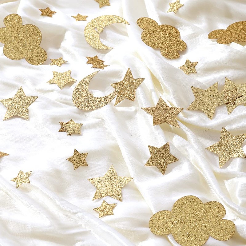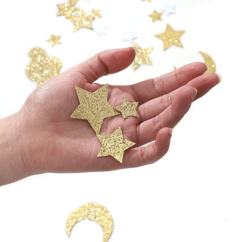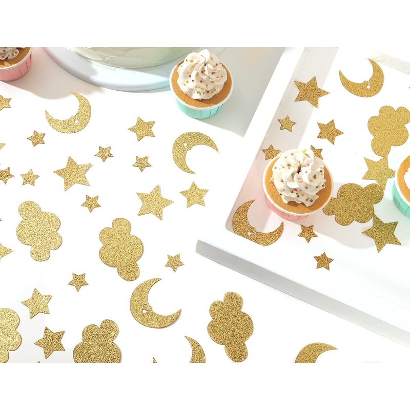 - ABOUT THE TWINKLE TWINKLE LITTLE STAR CONFETTI-If you are having a twinkle twinkle little star baby shower our moon and stars confetti is dreamy and will add the perfect touch to baby girl shower decoration. This confetti pack includes star confetti along with the moon and clouds confetti. This charming table scatter is exquisitely detailed
