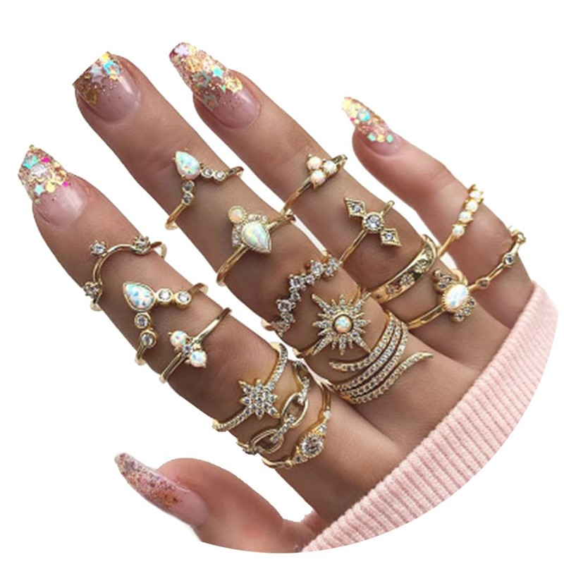 - Bohemian gold rings have 17 pcs with different sizes and styles. They can fit multiple fingers. You just switch them around to fit your fingers.
