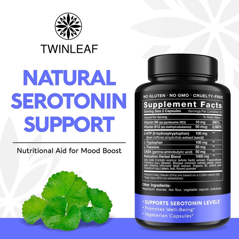 - Serotonin Supplement for Overall Health - boost your health with Twinleaf Serotonin Booster! This natural serotonin supplement for women and men is filled with L-tryptophan, 5-HTP, GABA, and B vitamins - ingredients that help you produce and absorb your serotonin. Serotonin supports your overall health, well-being, and energy levels, so it's a great source of wellness!