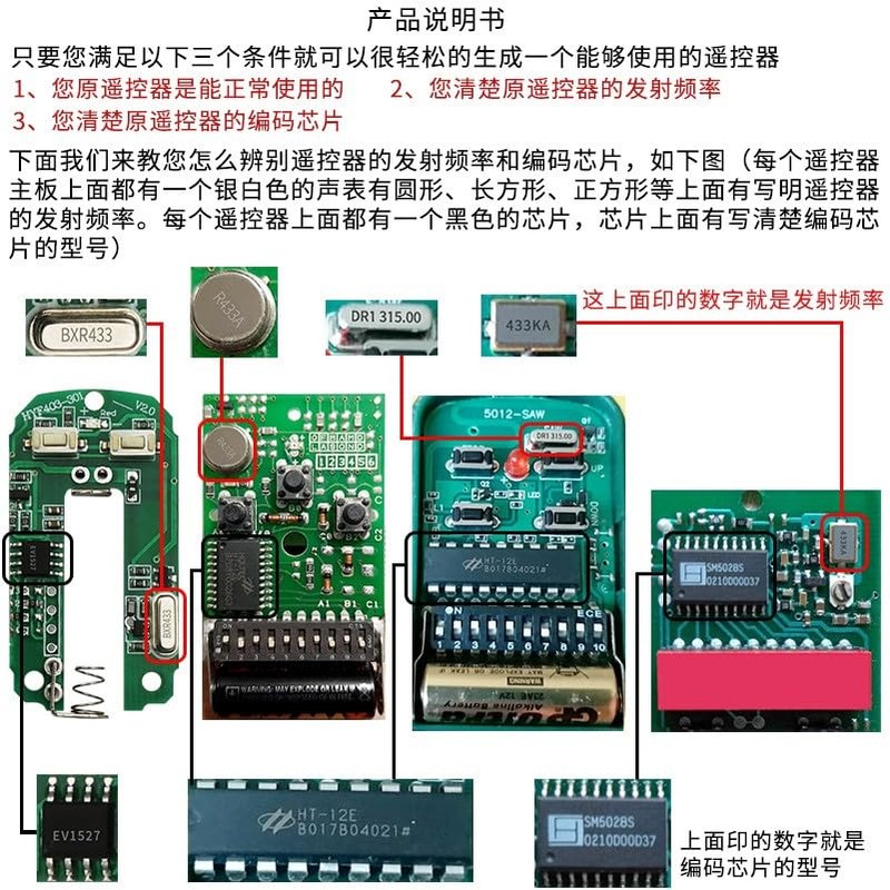 - Wide coding range】2260,2262(such as PT2262, SC2262, HS2262, LX2262, HX2262, etc.),1527(EV1527, HS1527, HX1527, SC1527, GP1527, CP1527, AD1527, SCL1527, TL1527, ZX1527)PT2264, PT2240(LX2240, LX2241, SCL2240), CS5211, SMC918, AX5026, SMC926, AX5326-3, AX5326-4, FP527, HT600, HT680, HT6207, HT6010, HT6012, HT6013, HT6014, HT12D, HT46F49E, PIC16F630, ULN2003.Although different chip manufacture has different chip model prefix, it will be OK, as long as the chip model numbers are same.