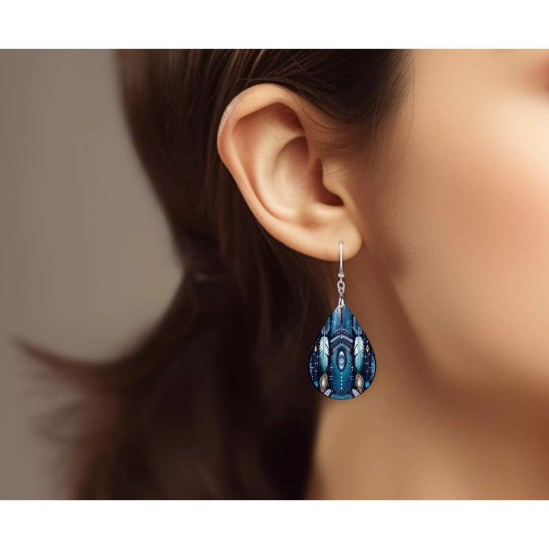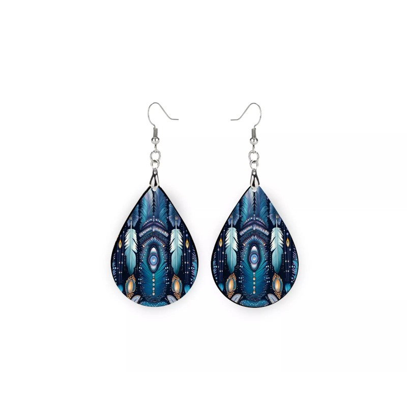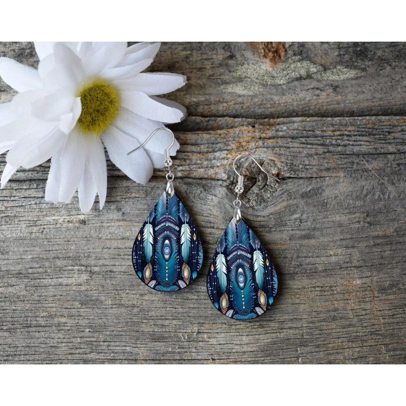 Twisted R Design Blue Feathers Earrings Handmade Wood Tear Drop Dangle Printed Jewelry