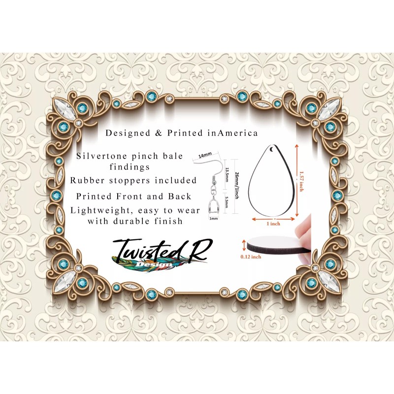 This set of tear drop earrings is created from a wood base that we have printed with a high quality digital image with our UV printer. The silver tone ear wires are hypo-allergenic. the tear drop portion of the earring is 1.5 inches long and 1 inch wide. These are light weight and comfortable to wear all day long. The backside of the earring is printed with a the same image