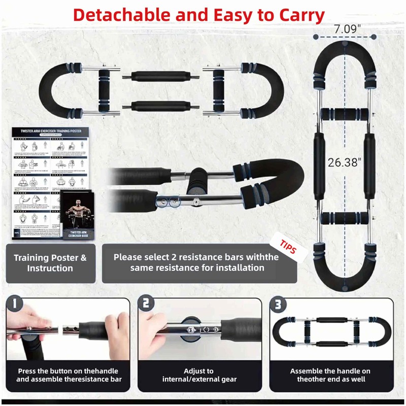 - 【Adjustable Resistance (40-110lbs)】The Twister Arm Trainer offers customizable resistance from 40 to 110 pounds,Its unique U-shape design not only targets your arms but also engages multiple muscle groups including the chest, wrists, back, legs, and shoulders, offering a versatile exercise experience