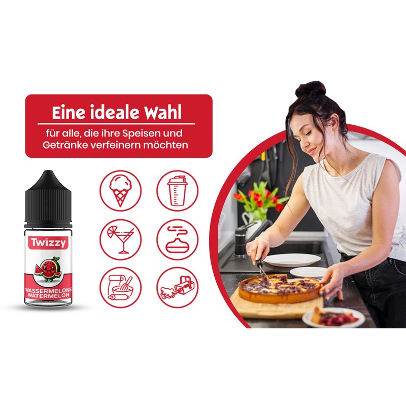 Discover the Twizzy watermelon aroma, a real addition to your kitchen. This intensely scented aroma provides an exceptional taste experience and is perfect for refining a variety of foods and drinks. It goes great in coffee, shakes, cakes, curd and yogurt and adds a special touch to any recipe. Our watermelon aroma is sugar-free, fat-free and lactose-free and therefore ideal for a conscious diet. It is also suitable for vegans and offers flexibility in use. You can adjust the aroma according to your wishes by adding your preferred sweetener. The practical dropper bottle allows for easy and precise dispensing, making the aroma ideal for use in cooking, baking and in drinks. It is perfect for creative chefs and home bakers who want to enrich their recipes with a touch of innovation and fruitiness. Discover the versatile uses of our watermelon aroma and experience how it takes your dishes to a new level