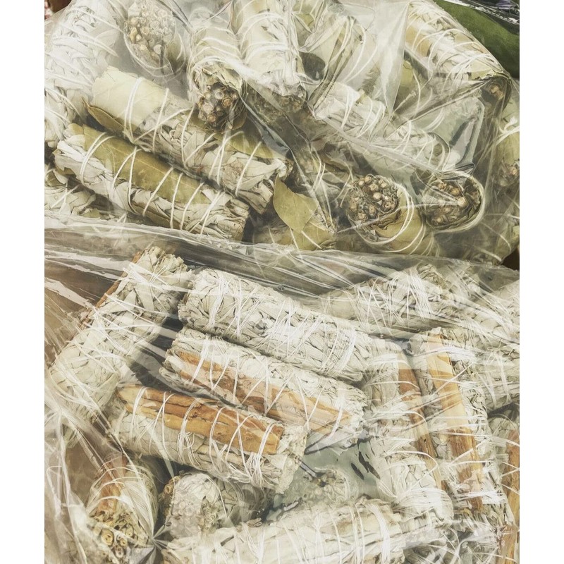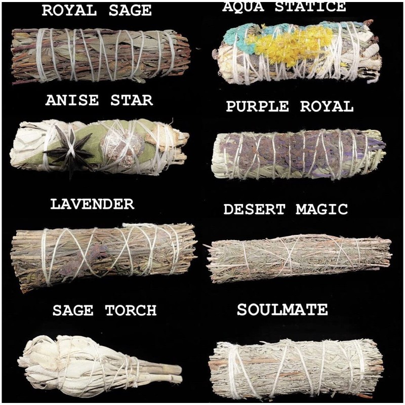 Two Handmade 4” Sage Smudges custom incense - Variety All handmade. Sold by two. 1. White Sage smudge - Cleansing & protection 2. Blue Sage smudge - Blessings & protection 3. Cedar smudge - Healing 4. Sage brush smudge - Cleansing 5. Lavender smudge - Peace & Calm 6. Royal sage smudge - Sacred & ancient 7. Pine Brush smudge - Rejuvenate 8. Desert Magic smudge - Wisdom & Clarity 9. Sage Torch smudge - Cleansing 10. Juniper smudge - Spiritual purification 11. Colorful sinuata smudge - Joy & Celebration (comes in assorted single colors) 12. Star smudge - Anise, Sage, Copal and ginger - Benefits: good luck 13. Aqua statice yerba smudge - Floral statice and yerba - Aromatherapy and weight reduction 14. Dollar sage smudge - Sage, lavender and eucalyptus for wealth 15. Patchouli smudge - Relaxation and ease tension 16. Dragon blood smudge - Power and Protection 17. Palo Santo smudge - Brightens energy and joy 18. Love smudge - blue sage and lavender 19. Rosemary smudge - Confidence and Beauty 20. Peppermint smudge - Recharge and Refresh 21. Bougainville smudge - Passion and fertility 22. Nag champa smudge - Positive vibrations 23. Holy basil lemon smudge - Blocks evil eye, protects mental health 24. Copal smudge - Soul search 25. Purple royal sage smudge - Abundance and harmony 26. Calendula smudge - Powerful and nourishing 27. Red sage smudge - Dragon blood resin 28. Good vibes smudge - Combination herbs, good luck 29. Sinuata Lavender smudge - Spiritual Growth & Wellness 30. Chakra Mullein smudge - Alignment & Dream Catcher 31. Bay Leaves smudge - Anxiety & Immunity 32. Panacium Statice smudge - Success & Growth 33. Red Wildflower smudge - Strength & Power 34. Cinnamon smudge - Brain Function & Memory 35. Hibiscus smudge - Sacred & boosts immunity 36. Yerba Santa smudge - Holy herb & Growth 37. Frankincense smudge - Anti-aging & Meditation 38. Soulmate smudge - Romance & Relationship 39. Black Sage smudge - Mugwort & Magical 40. Rose Sage smudge - Attraction & Purity 41. Chakra Rose smudge (7 colors) - Alignment & Abundance 42. Eucalyptus smudge - Energy, heal & recharge 43. Thyme smudge - Spiritual strength & courage