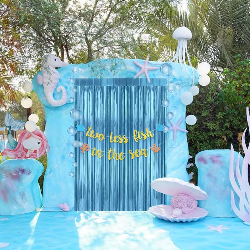 - Underwater Party Theme:you will get 1X"Two Less Fish in the Sea "Gold Glitter Banner,1X Bubble Banner, 1X Blue Rain Curtain,Pair with sea creature balloons, shell garlands, and blue hues for a cohesive coastal or mermaid-themed party. Great for kids' birthdays, bridal showers, and more!