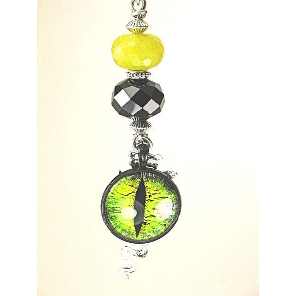 Two-Sided Ceiling Fan Pull with Green Dragon Eye, Silver Dragon Charm and Jade Stone