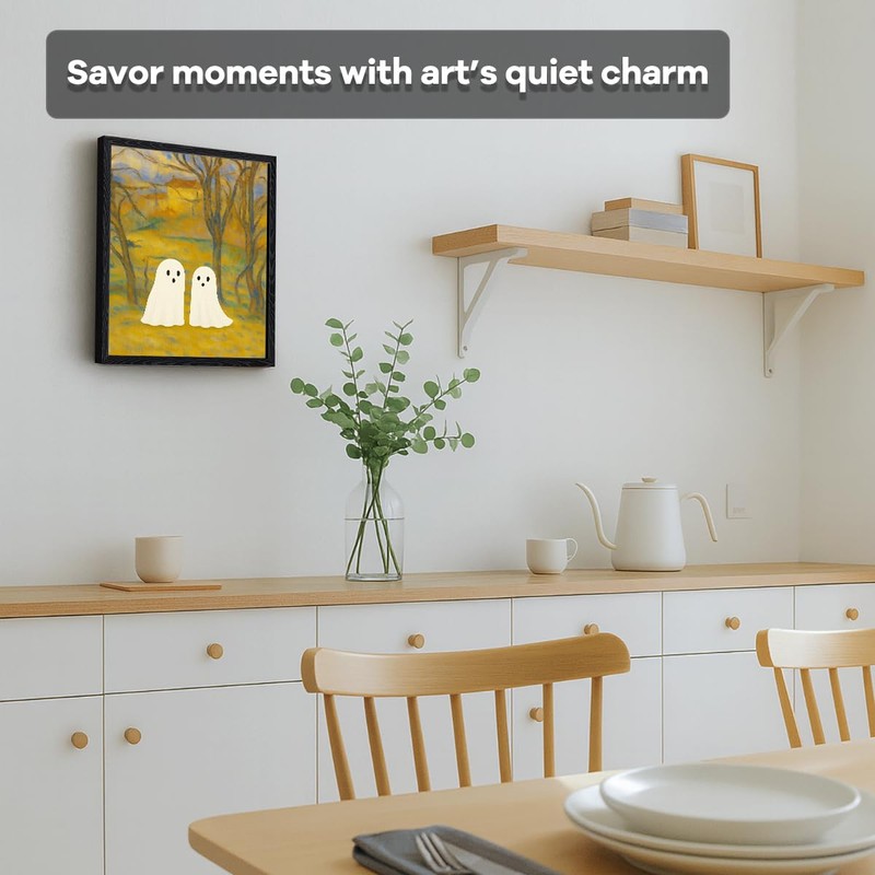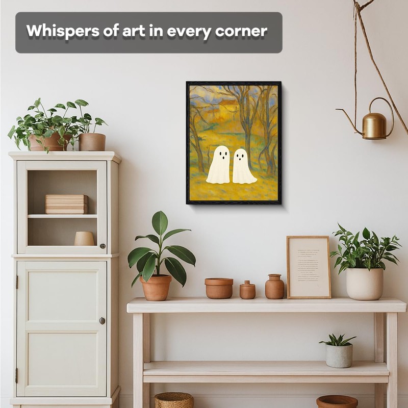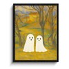 Two white sheet ghosts in fall woods, Post-Impressionist style ghost pictures wall decor, matte framed ghost wall art, Funny ghost pictures for home, gift for Halloween, 8x10 inch