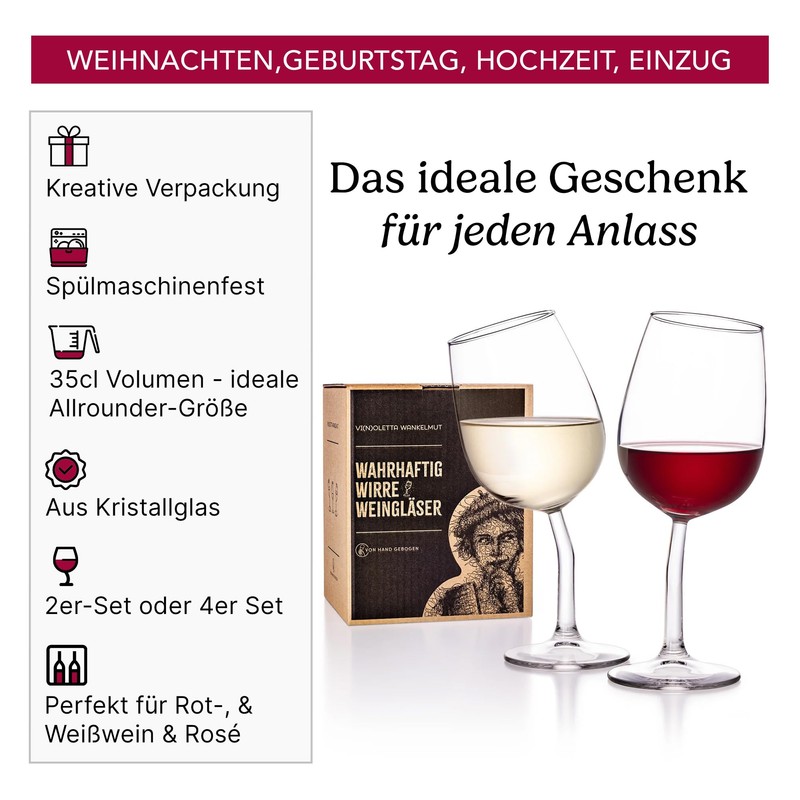 - Packaging with taste: in combination with the creative packaging, our sturdy drinking glasses are an ideal gift for women and men, your friends and loved ones. Vi(n)oletta is perfect for real wine lovers and hobbyists.