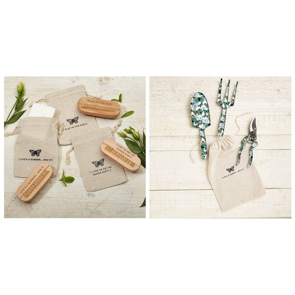 "Life is Garden...Dig In" 3 Pc Gardening Tool Set in Draw String Bag Includes: Trowel, Cultivator, Shears - Aluminum. Gardener's Care Kit in Drawstring Gift Bag Includes: Nail Brush and Lemon Sage Scented Soap Assorted 3 Sayings: Life's Garden, Play in the Dirt, Get My Hands Dirty - 100g Soap/Wood/Cotton Canvas