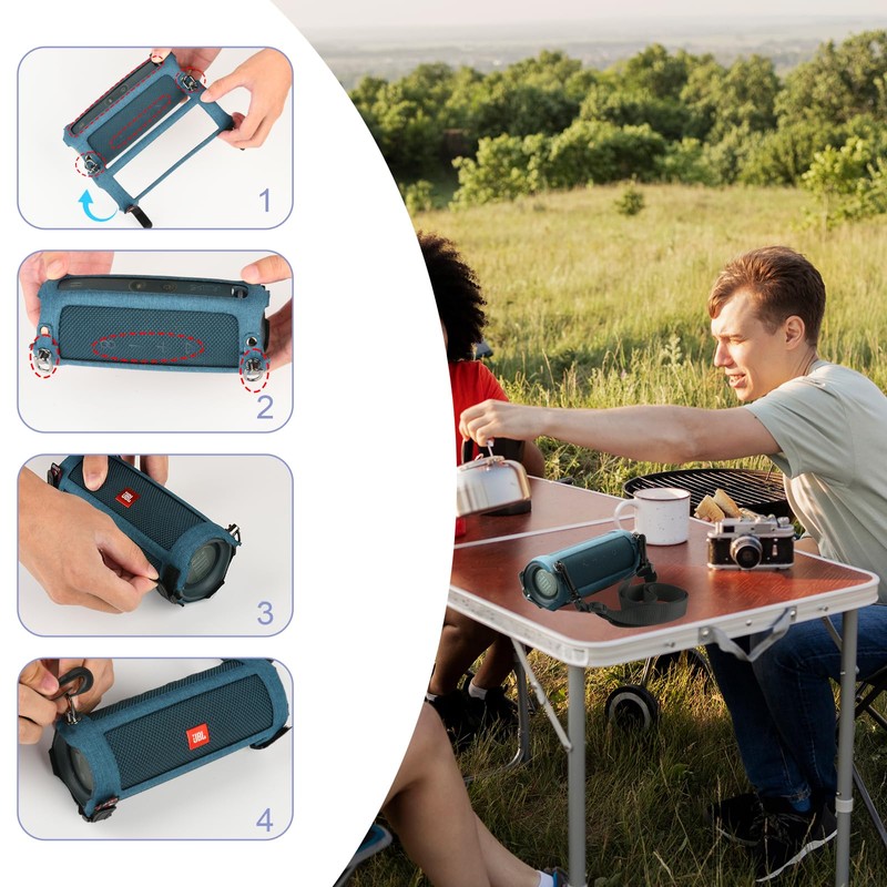 - 【Easy to Use】This protective case is very easy to install: Align the case and speaker at the charging point, keep metal buckle on top, then fasten the hook and loop straps. There are two raised bumps at the bottom which will keep the speaker lay flat steady for a better sound.