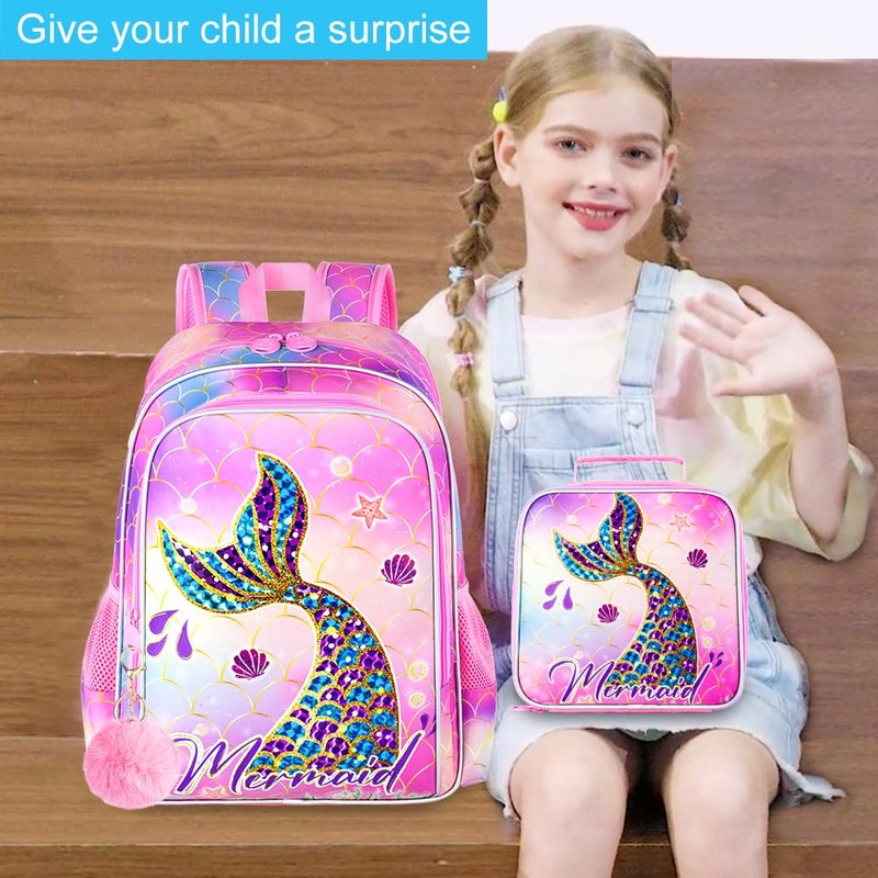 - Four-piece Girls Backpack: Mermaid backpack for girls (16"x 12"x 6" In) + Lunch Box (9"x 9"x 3" In) + Pencil Bag + Furry Pom. New reflective strip design on the front to keep kids safer at night.