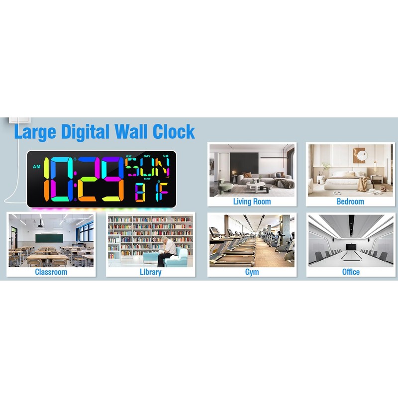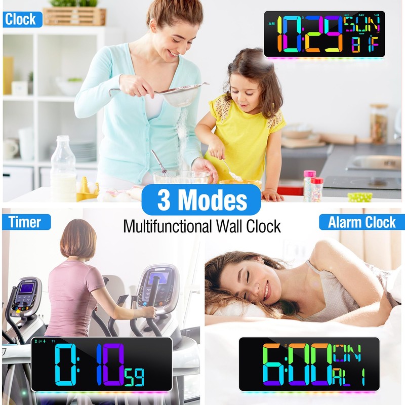 - [11 RGB color digital display + 9 RGB night light] The digital wall clock is available in 5 RGB color modes and 6 monochrome modes. What's more, the large digital clock offers not only an automatic brightness mode, but also 4 levels of adjustable brightness, allowing you to easily adjust the color of the clock to your personal preference or current environment.