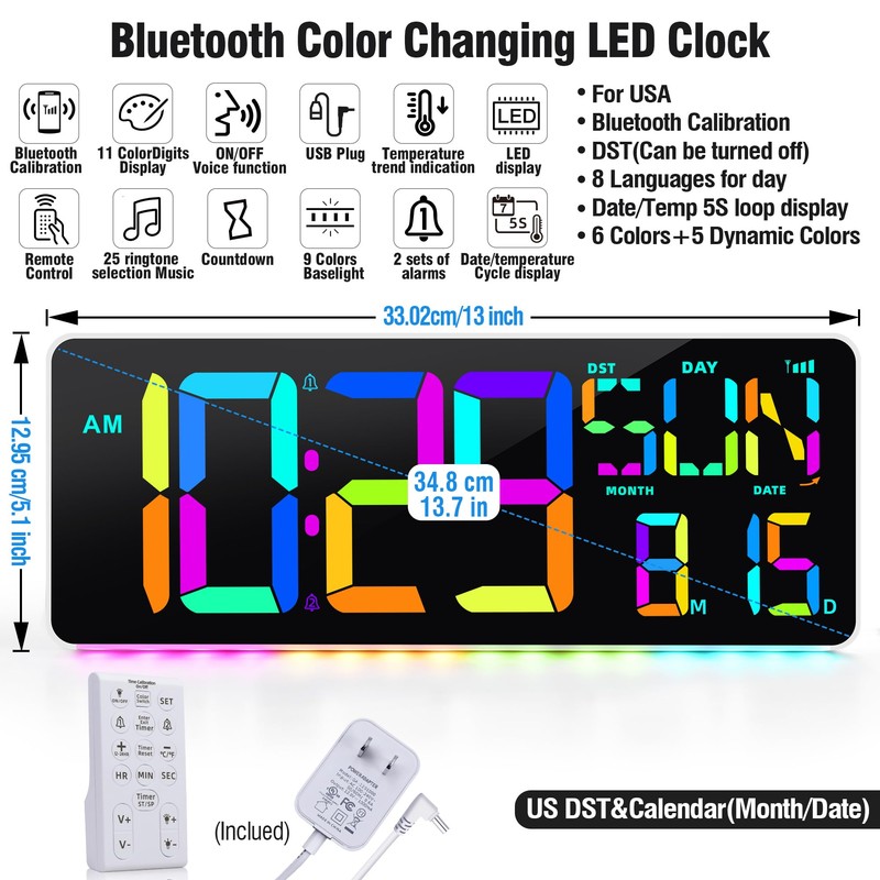 TXL 13.7" Bluetooth Large LED Digital Wall Clock with Night Light, 11 RGB Color Changing, Count Up/Down Timer Clock with Remote Control, Adjustable Brightness Wall Clock for Home, Office, Auto DST.
