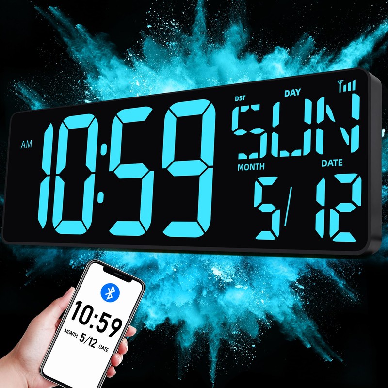 TXL 17.2" Large Digital Wall Clock Bluetooth Sync Time, LED Wall Clock with Date and Temperature, Count Up/Down Timer Clock with Remote Control, Adjustable Brightness Alarm Clock