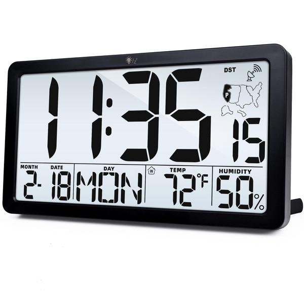 TXL Atomic Wall Clock with Backlight, Battery Operated Digital Wall Clock with Temperature, Humidity and Date, Large Display, Auto DST, 6 Time Zone(Black)