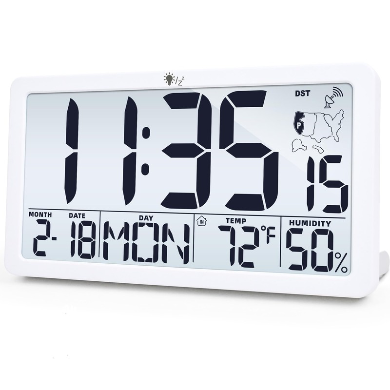 TXL Atomic Wall Clock with Backlight, Battery Operated Digital Wall Clock with Temperature, Humidity and Date, Large Display, Auto DST, 6 Time Zone(White)