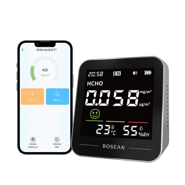 - 5 in 1 Indoor Air Quality Monitor with WiFi App and Web Dashboard, PM2.5, HCHO,Temperature and Humidity Meter