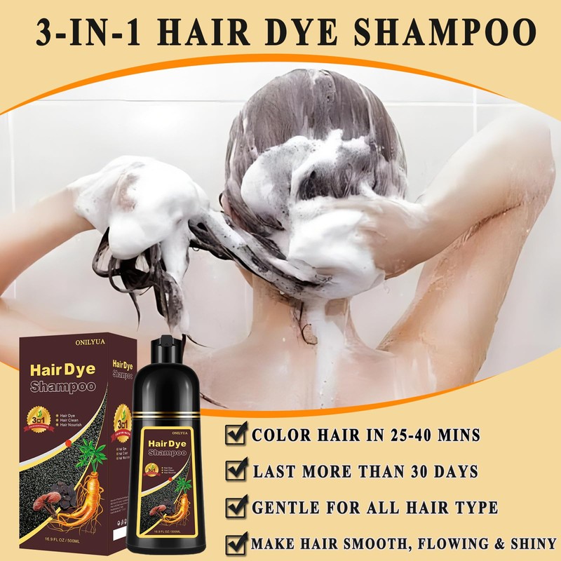 - 3 In 1 Hair Dye: Transform your hair in just 25-40 minutes. Used for hair dye, hair shampoo and hair conditioner, which is economical and affordable! No longer affected by gray hair and rejuvenate! Please Note: Take a skin test 24 hours before use.