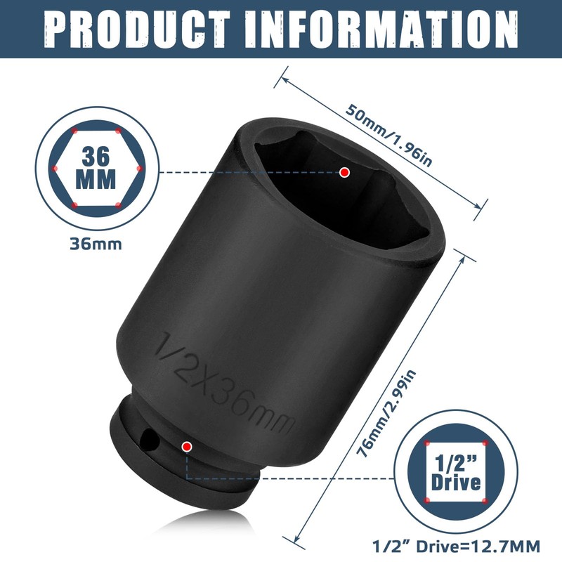 - Package Content 1 x 36mm Hex Socket with 1/2" Drive Product Size: 5cm x 5cm x 7.5cm, Package Weight: 455g