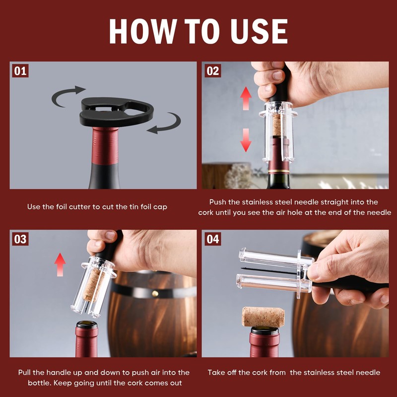 - Safe & efficient: the bottle opener has a built-in air pressure mechanism, which makes each opening easy and safe, opening the bottle no strong pulling required, only need to pump 4-6 times to remove the cork, easy to open for women and seniors