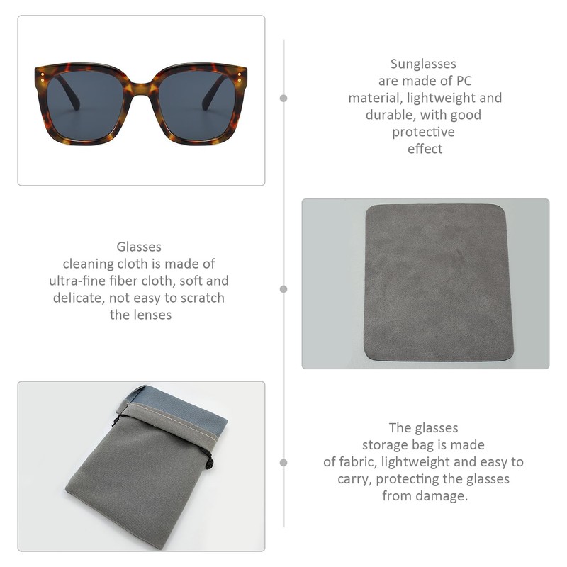 - Product material: sunglasses are made of PC material, which is lightweight and durable and has a good protective effect; the glasses cleaning cloth is made of microfibre cloth, which is soft and sensitive and the glasses storage bag does not scratch easily; made of lightweight and easy to wear fabric. Protect the glasses from damage.