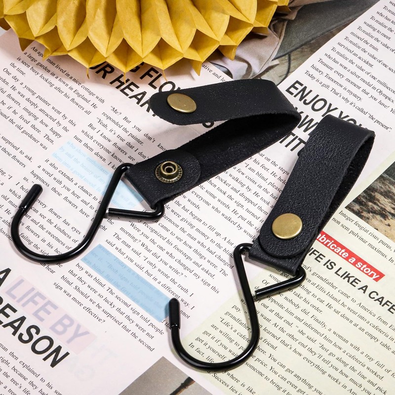 - Metal S Hooks Combined with Leather Straps: these hooks perfectly combine the S hook with the leather strap, which opens and closes with a push button for quick and easy access. The S hook is fixed by rivets and will not fall off like other S hooks when you pick up the item, which is very convenient.