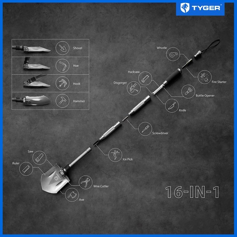 - Why TYGER ? US registered patent design shovel forged to last from military grade solid carbon steel and aerospace grade anodized aluminum tubes.