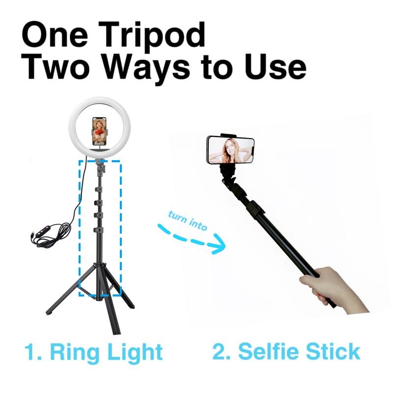 With a standard 1/4 screw mount on the top, you can easily mount it on smart phones, cameras, pads, and GoPros. The tripod stand itself can be used as a selfie stick and phone tripod.BLUETOOTH REMOTE CONTROL & USB POWER SUPPLY The 10 Inch LED Ring Light comes with a wireless bluetooth remote control, allowing you to take photos without touch the panel, enhancing the user experience.
