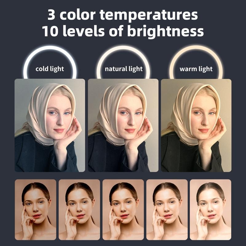 MULTIPLE LIGHT MODE3 Light Mode & Adjustable Color Temperature & 10 Brightness Variations. Our LED ring light features 3 color temperatures: Warm, Natural, and White. Each light mode comes with 10 brightness levels and the color temperature could be adjusted from 3000K to 6000K.HIGH BRIGHTNESS SLIM LED LIGHT: With a CRI≥97, our LED ring light contains 120 LED bulbs and produces premium lighting quality that brings a real and natural color and high color reproduction, greatly reduce the later work of color adjustment.