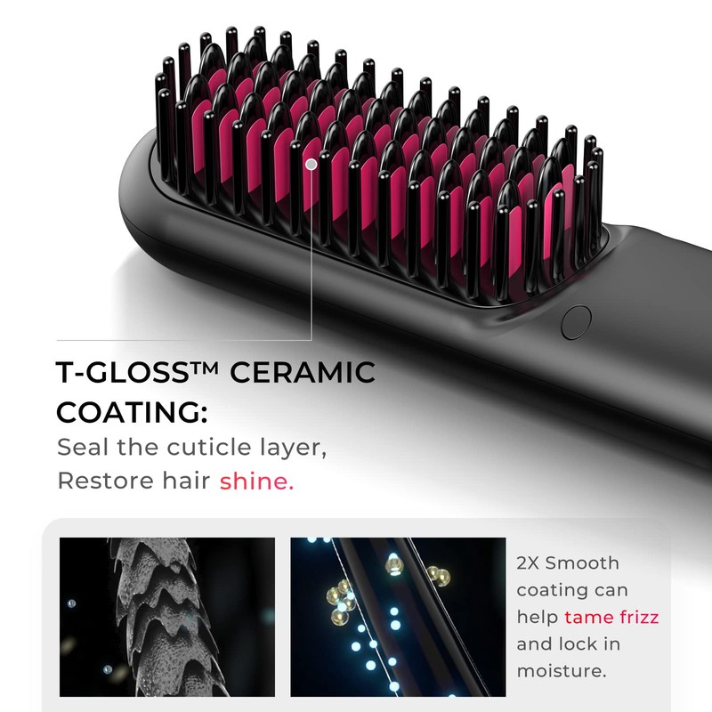 - LESS FRICTION, LESS DAMAGE: The brush's teeth are coated with our exclusive T-GLOSS ceramic material, which is twice as smooth as ordinary materials and reduces friction by 50%. This means that the comb glides effortlessly through your hair without pulling or snagging, resulting in less damage to your hair and a smoother, more polished look.