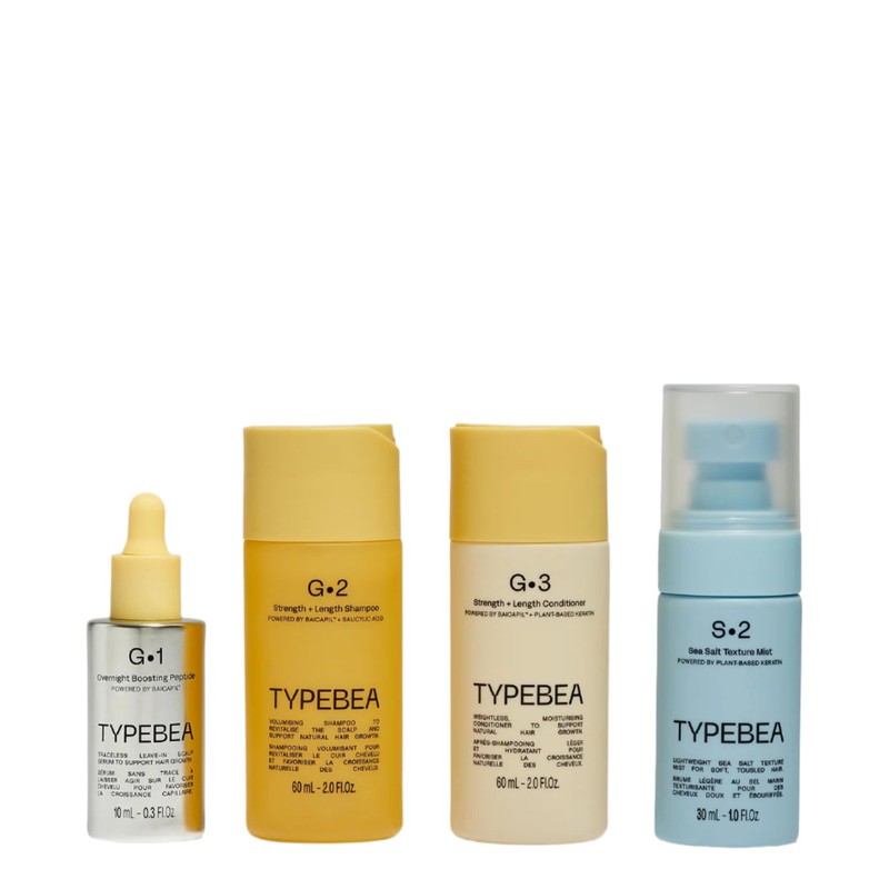 The TYPEBEA Sampler Bundle is a curated collection of hair care essentials designed to enhance and maintain healthy hair. This exclusive sampler bundle from TYPEBEA offers a selection of premium hair care products that cater to various hair needs, from boosting hair strength and length to adding texture and volume. Each product is crafted with high-quality ingredients to ensure optimal results, making it an ideal choice for those looking to try out TYPEBEA's renowned hair care line. What is included in TYPEBEA Sampler Bundle? • G1 Overnight Boosting Peptide Serum 10ml • G2 Strength + Length Shampoo 60ml • G3 Strength + Length Conditioner 60ml • S2 Sea Salt Texture Mist 30ml What are the features and benefits of TYPEBEA Sampler Bundle? G1 Overnight Boosting Peptide Serum: This serum is designed to work overnight, delivering a powerful blend of peptides that help to repair and rejuvenate hair, leaving it stronger and more resilient by morning. G2 Strength + Length Shampoo: Formulated to gently cleanse while promoting hair strength and growth, this shampoo is enriched with nourishing ingredients that support healthy hair development. G3 Strength + Length Conditioner: Complementing the shampoo, this conditioner provides deep hydration and fortification, helping to reduce breakage and enhance hair length and vitality. S2 Sea Salt Texture Mist: Perfect for creating effortless beachy waves, this mist adds texture and volume to hair, giving it a natural, tousled look without the need for heat styling. Who is TYPEBEA Sampler Bundle for? The TYPEBEA Sampler Bundle is ideal for individuals seeking to explore and experience a range of high-quality hair care products tailored to enhance hair health and style.