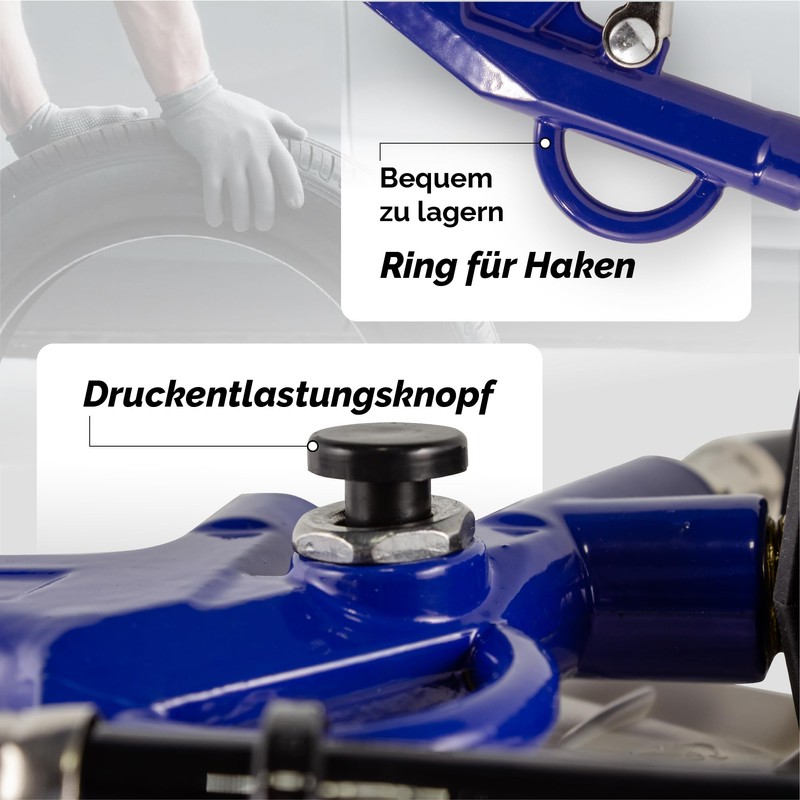 - With the help of a pressure gauge, the user visually monitors the pressure in the tyre. Thanks to the eye on the housing, the device can be easily and easily stowed away when hanging.