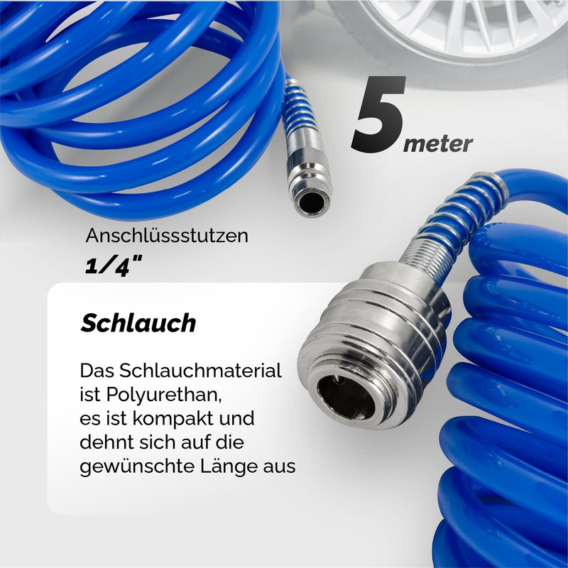 - For working in hard-to-reach places, the model is equipped with a flexible hose. This model has a pressure relief valve, 1/4 inch connection piece, the housing of the pressure gauge is protected by a rubber cover.