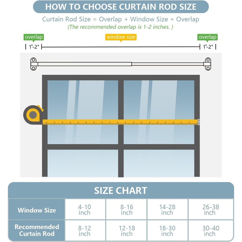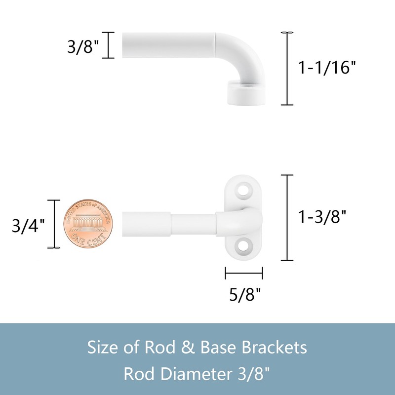 - Rod diameter 3/8 in. (10 mm), with a thin diameter. (Attention: When choosing the rod size, DON'T forget add the bracket overlap to your curtain rod length. CURTAIN ROD SIZE= OVERLAP(1-2")+ WINDOW SIZE+OVERLAP(1-2"))
