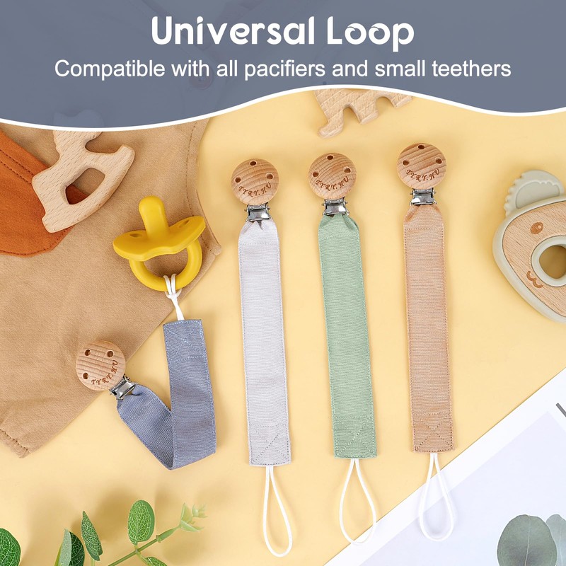 TYRY.HU Dummy Chain Girls Fabric Dummy Chain Clips Boys Soft Fabric Polyester Dummy Holder Set Wooden Dummy Strap Cotton Dummy Strap for Newborn Gift Pack of 4