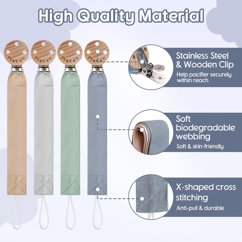 - Baby safety: 4 pack pacifier holders are made of soft, handmade fabric, which is soft to the touch, skin-friendly and non-toxic to ensure baby's comfort and safety, free of BPA, PVC, lead and phthalates, with ventilation holes to avoid choking hazards, and meets European testing requirements