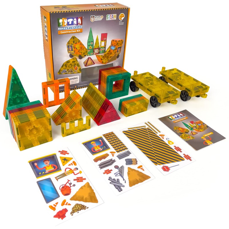 - INCLUDES – 1 Tytan Tiles 60-Piece Construction Magnetic Building Set and carrying bag for portability and stress-free storage. Beyond the building tiles of different shapes, 2 wheeled based vehicles and multiple construction themed sticker decals are included to help complete the look!