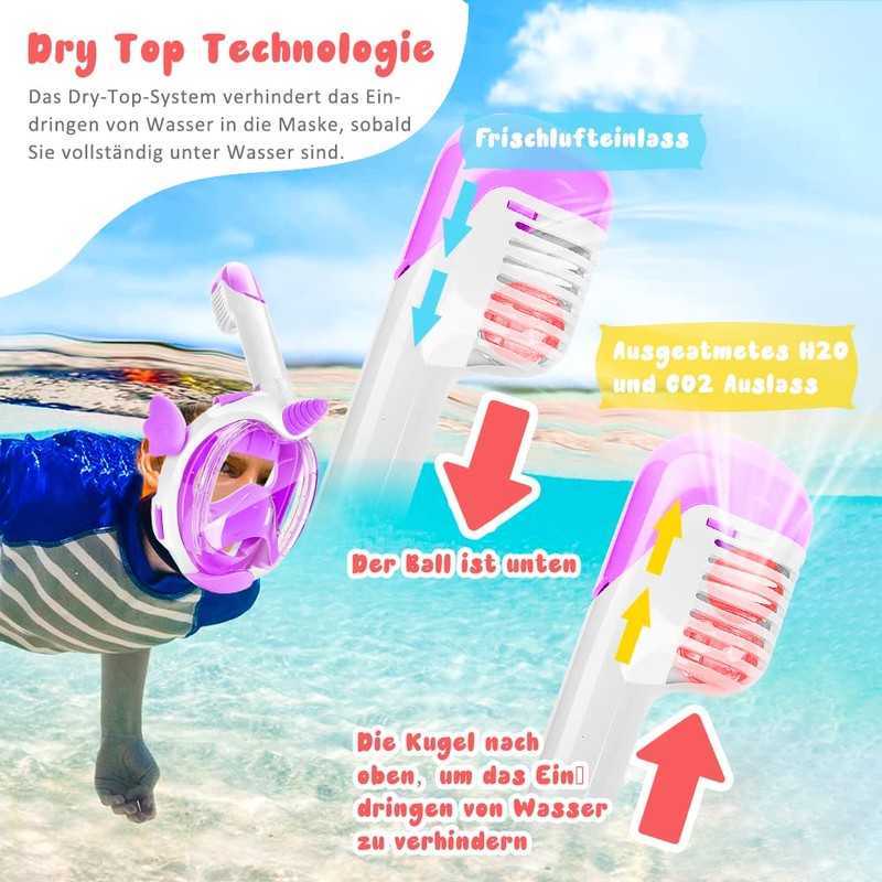 - Dry top system: the dry top system prevents water from entering the mask as soon as you are completely underwater. The snorkel mask for children is permanently in the best position for nose or mouth breathing. Our technology prevents water from flowing through the snorkel into the mouth. Children can enjoy the underwater world to their heart's content without worrying about seawater coming out of the pipes in the mouth.