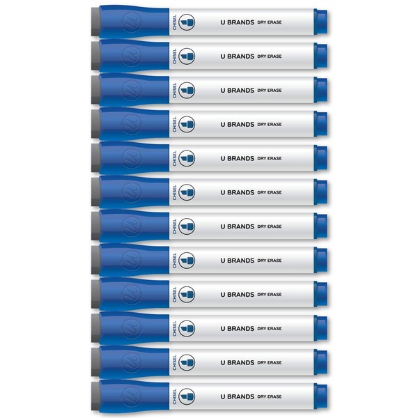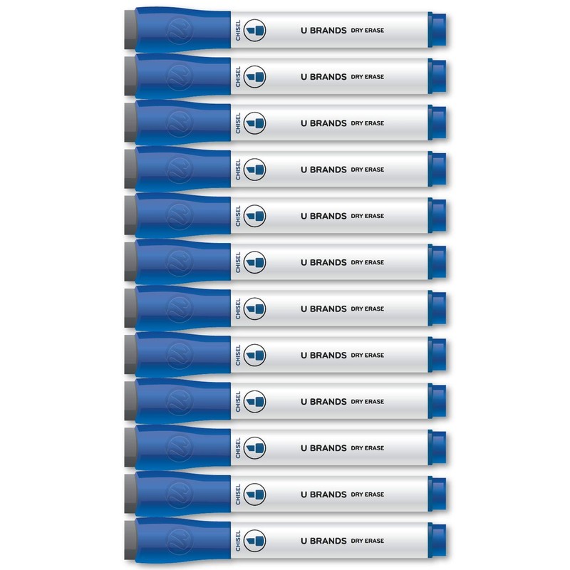 U Brands chisel tip dry erase markers feature bold and vibrant color inks that dry quickly, erase easily and work great on any dry erase board surface. The markers also feature long-lasting, non-toxic, low odor ink that is great in any classroom, home or office environment. This dry erase marker value pack features 12 blue markers. The dry erase markers feature a chisel tip for a bold and precise writing experience on any melamine, painted steel, porcelain or glass dry erase surface. The built-in felt eraser into the marker cap enables quick, convenient and precise erasing. For best results, re-cap the marker immediately after use and store horizontally.