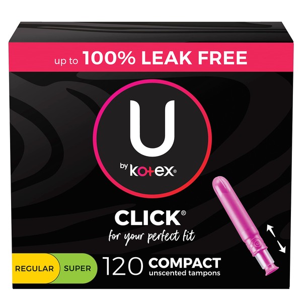 U by Kotex Click Compact Multipack Tampons, Regular/Super Absorbency, Unscented, 120 Count (8 packs of 15)