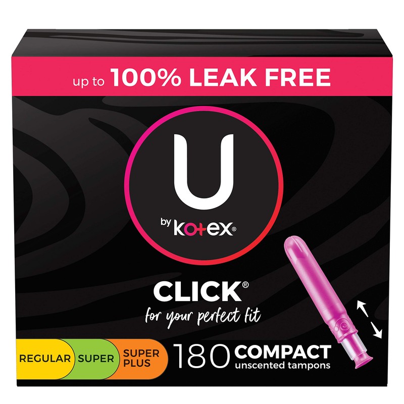 Get up to 100% leak-free protection and stay confident throughout your day with U by Kotex Click Compact Tampons! Made without fragrance, Click tampons for women are designed for your comfort and have a smooth tip for easy and comfortable insertion. Each tampon features ComfortFlex grooves that move with y ou for outstanding comfort. Try U by Kotex Click Tampons and see why the #1 compact tampon* is chosen by women every 1.9 seconds. Pocket-sized and small enough to carry in your purse or pocket, these tampons go from compact to a full-size tampon in one easy step giving you comfortably compact, powerful protection. Pull the lower half of the tampon and when it locks in place, it’s ready to go! U by Kotex Click Compact Tampons are available in regular, super and super plus absorbencies. For backup period protection, try U by Kotex Barely There Pantiliners. U by Kotex feminine products are FSA/HSA/HRA- eligible in the U.S. Packaging may vary from images shown.*Based on sales data**Among those with a preference