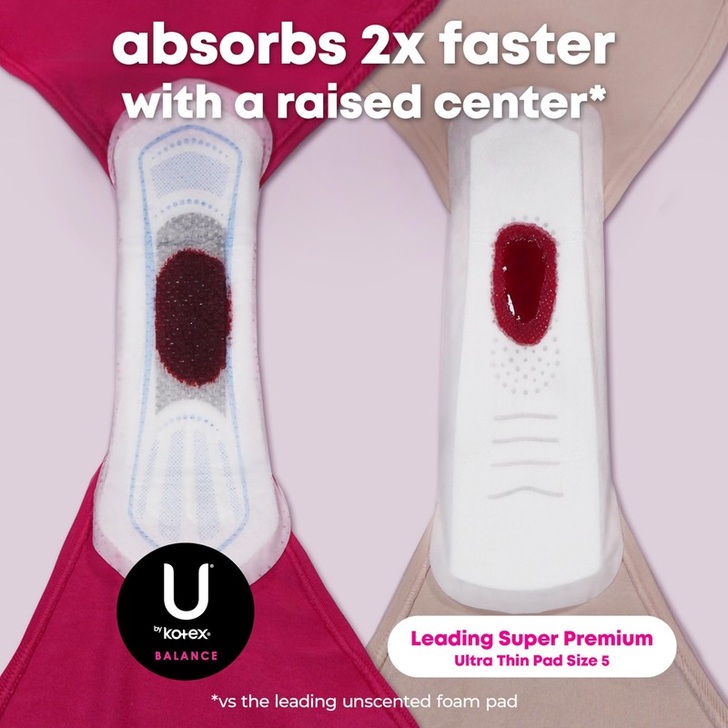Get the period pad that is designed for long-lasting protection with U by Kotex Balance Ultra Thin Pads with Wings. Each heavy absorbency feminine pad comes with a raised center that absorbs 2x faster.* The raised center absorbs quickly for up to 100% leak free protection and helps to lock away blood, sweat and odor, so you can worry less and live more. On top of that, our menstrual pads are dermatologist tested to be gentle on skin. These pads are pH-balanced and made without fragrance, lotions, pesticides, parabens, elemental chlorine and natural rubber latex. Designed to fit your body's curves, our heavy absorbency pads with wings help eliminate gaps and prevent leaks while providing outstanding skin comfort to help you get through your day even when you are experiencing heavier flows. Each sanitary pad is individually folded and wrapped to protect your pad with easy access, even on-the-go. For overnight protection in any sleep position, try U by Kotex Balance Ultra Thin Overnight Pads. U by Kotex feminine pads are FSA/HSA/HRA-eligible in the US. Packaging may vary from images shown. )(*vs. the leading unscented foam pad)