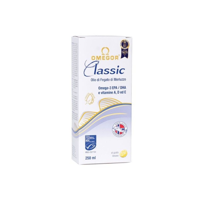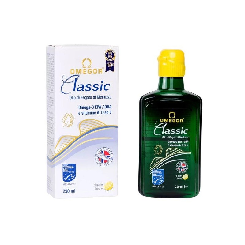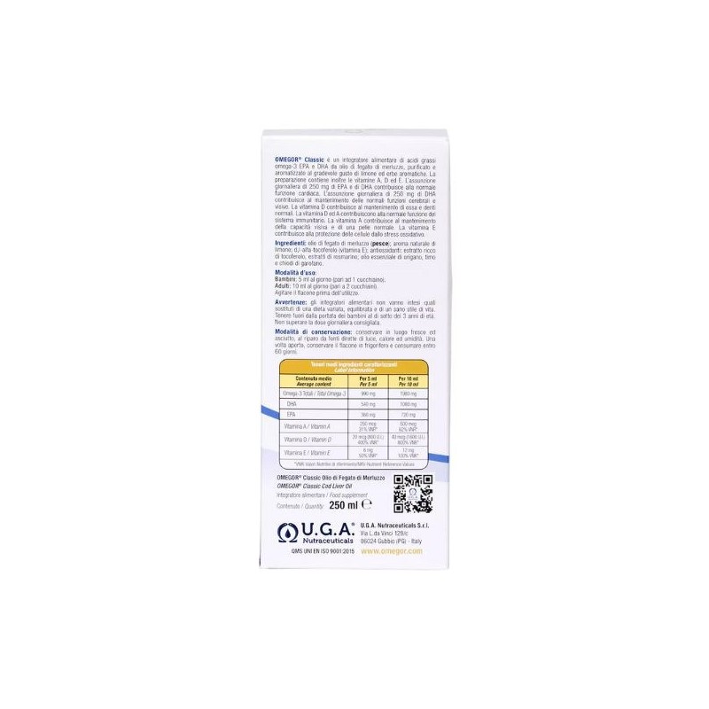 UGA Omegor Classic Omega 3 EPA & DHA + Vitamins A, D & E Lemon Flavour is a liquid cod liver oil (CLO) supplement that offers incredible health benefits, as it contains four essential nutrients: omega-3 (EPA/DHA) and vitamins D, A, and E.