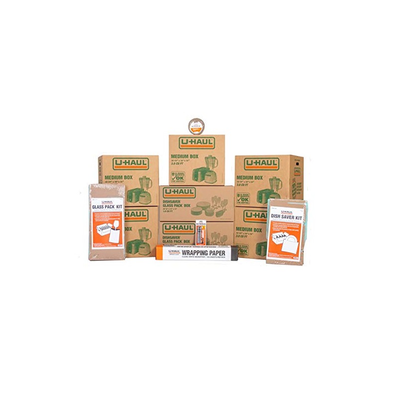 U-Haul Kitchen Moving Kit – Includes 1 Dish Packing Kit, 1 Glass Packing Kit, 5 Medium Boxes, Packing Paper, Cushion Foam, Tape, 2 Box Markers, and 1 Box Knife
